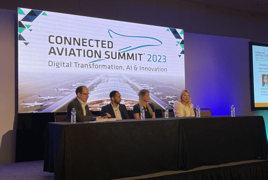 Panelists discuss IFC business models at the Connected Aviation Intelligence Summit. Pictured above, from left: Mark Holmes (Via Satellite); André Patrick, Air Canada; Brittany McSweeny, Southwest Airlines; and Angela Vargo, Breeze Airways. (Photo: Access Intelligence)