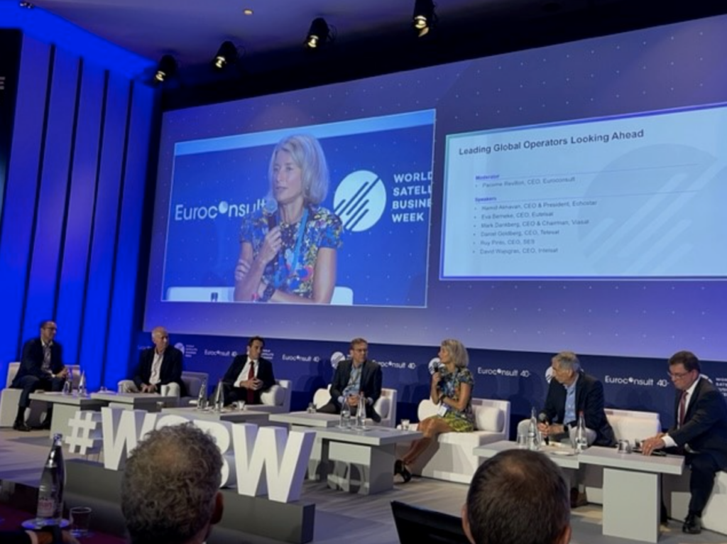 Satellite operator CEOs speaking at the 2023 World Satellite Business Week event in Paris (Photo: Rachel Jewett)