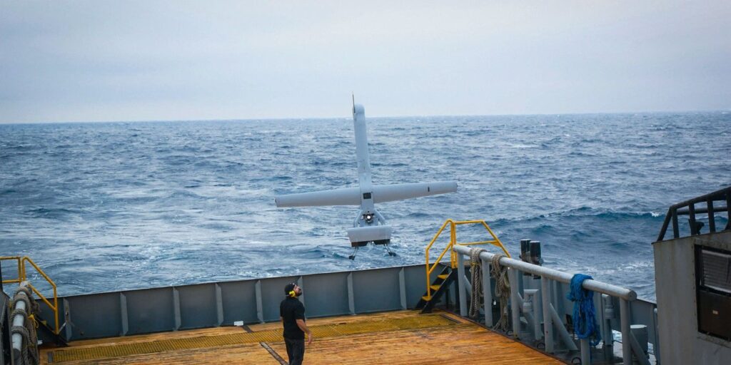 Pictured above is the Shield AI V-Bat aircraft, used by the Canadian Coast Guard to conduct offshore sea trials. (Photo: Kongsberg Geospatial)