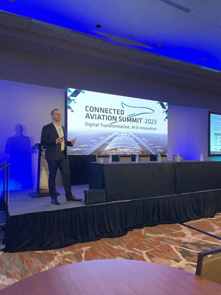 Bobby Anderson of Shift5 presents on the topic of “Onboard Intelligence and the New Horizon of Observability” at the Connected Aviation Intelligence Summit. (Photo: Jessica Reed)