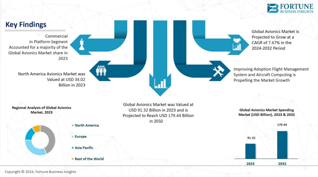 According to new research released in September 2024 by Fortune Business Insights, the global avionics market size was valued at USD 91.32 billion in 2023 and is projected to grow from USD 99.33 billion in 2024 to USD 179.44 billion by 2032, for a compound annual growth rate (CAGR) of 7.67% during the forecast period. North America dominated the avionics market in 2023 with a market share of 37.25% (see chart).