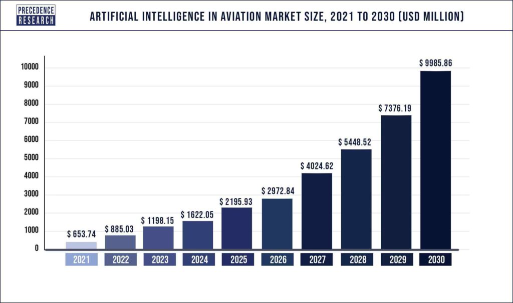 According to Precedence Research, the global AI in aviation market size was estimated at USD 653.74 million in 2021 and it is expected to surpass around USD 9.98 billion by 2030 with a CAGR of 35.38% from 2022 to 2030 (see chart).