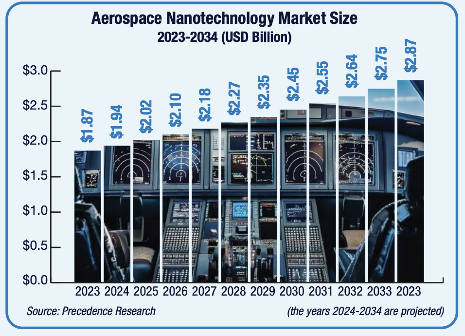 According to Precedence Research, the global aerospace nanotechnology market size was USD 5.30 billion in 2023, calculated at USD 5.51 billion in 2024 and is expected to reach around USD 8.10 billion by 2034, expanding at a compound annual growth rate (CAGR) of 3.93% from 2024 to 2034.
