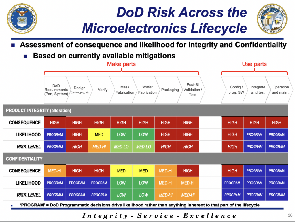 Dr. Victoria Coleman, Chief Scientist of the Air Force, remarked that there has been a false dichotomy between Trusted Foundry and Microelectronics Quantifiable Assurance. “While Microelectronics Quantifiable Assurance is focused on the entire lifecycle of the microelectronics and offers enhanced integrity protection, Trusted Foundry focuses exclusively on fabrication, a protection that heightens our confidence that our classified information has been protected during the commercial manufacturing of the parts we use in Department of Defense systems,” Dr. Victoria Coleman explained.